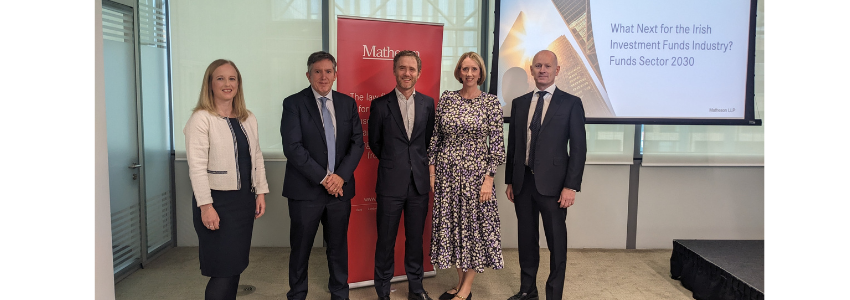 We were delighted to be joined at our recent Funds Sector 2030 event by Brian Corr, head of Funds Review at the Irish Department of Finance and Colm McDonagh, Chair of Irish Funds and CEO at Insight Investment. Brian and Colm joined Matheson partners Tara Doyle, head of our Asset Management and Investment Funds Department, and Gerry Thornton from our Tax Department on a panel chaired by professional support lawyer Brónagh Maher to discuss the Department of Finance’s consultation titled “Funds Sector 2030: A Framework for Open, Resilient & Developing Markets”.