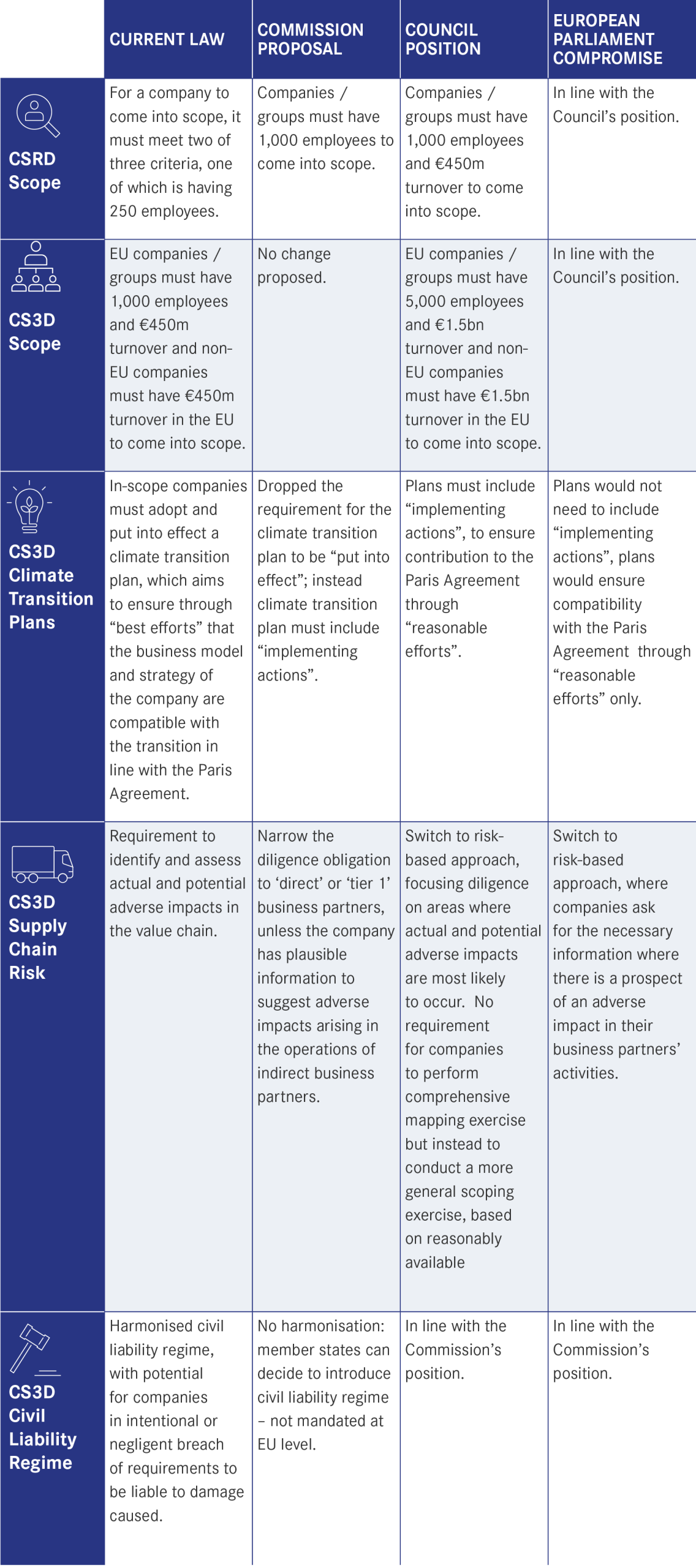 As the omnibus simplification package enters trilogue, each EU institution’s views on certain key changes proposed to the CSRD and CS3D can generally be summarised as follows: