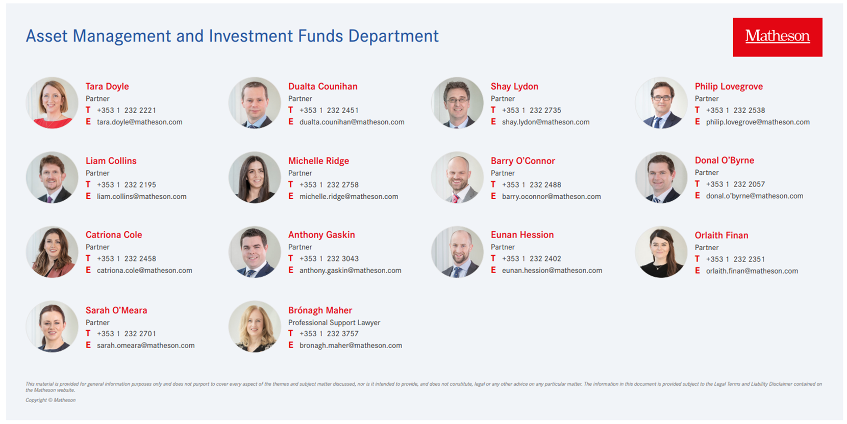 Please get in touch with your usual Asset Management and Investment Funds Department contact or any of the contacts listed in this publication should you require further information in relation to the material referred to in this update. Full details of the Asset Management and Investment Funds Department, together with further updates, articles and briefing notes written by members of the Asset Management and Investment Funds team, can be accessed at www.matheson.com.